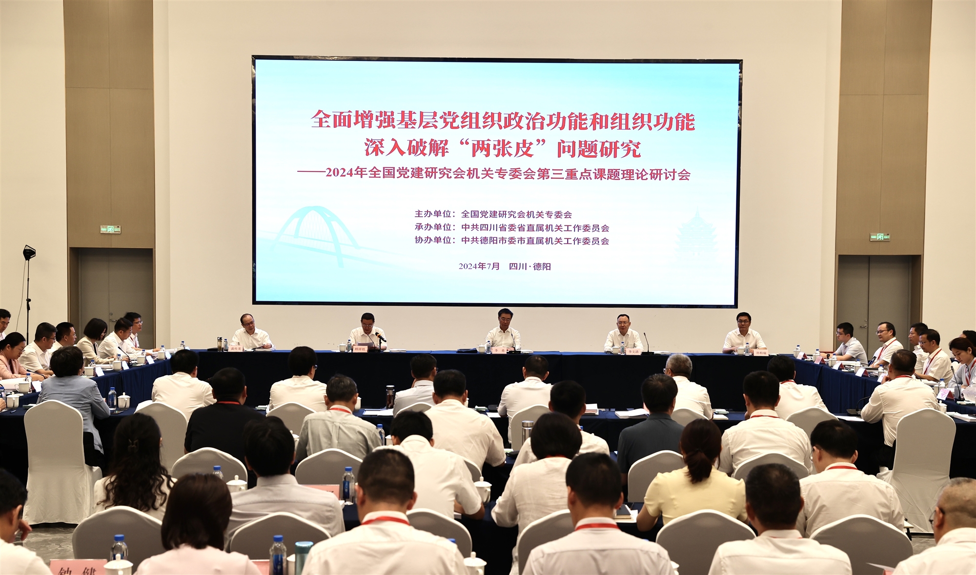 7月26日,全面增強基層黨組織政治功能和組織功能,深入破解“兩張皮”問題研究——2024年全國黨建研究會機關專委會第三重點課題理論研討會在四川德陽召開。十四屆全國人大社會建設委員會副主任委員、全國黨建研究會機關專委會主任委員李勇出席會議并講話。省政府副省長、黨組成員,德陽市委書記李文清出席會議并致辭。全國黨建研究會理事、機關專委會副主任委員顧祥勝,中央和國家機關工委基層組織建設指導部一級巡視員、全國黨建研究會機關專委會副主任委員孫柏瑜,省委省直機關工委常務副書記、省委省直機關黨校校長黃傳龍出席會議。