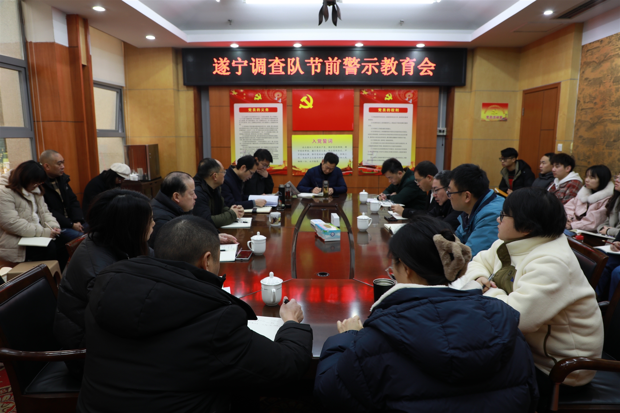 會(huì)議再次學(xué)習(xí)總隊(duì)黨組紀(jì)檢組《關(guān)于2024年元旦、春節(jié)期間廉潔過節(jié)的通知》要求,重點(diǎn)傳達(dá)學(xué)習(xí)了中央和國家機(jī)關(guān)紀(jì)檢監(jiān)察工委印發(fā)的《中央和國家機(jī)關(guān)6起違反中央八項(xiàng)規(guī)定精神典型問題通報(bào)》、國家統(tǒng)計(jì)局4起違紀(jì)違法典型問題通報(bào)和遂寧市紀(jì)委監(jiān)委通報(bào)的兩起違反中央八項(xiàng)規(guī)定精神的典型案例,組織干部職工集中觀看《持續(xù)發(fā)力 縱深推進(jìn)—解決獨(dú)有難題》警示教育專題片。