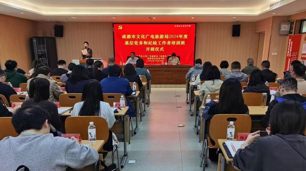 開班儀式上,成都市文廣旅局相關負責人作動員講話,強調機關黨務、紀檢工作者要帶頭學習好貫徹好黨的二十屆三中全會精神,深化黨的創新理論武裝,開拓思路,進一步強化以高質量黨建促進高質量發展的政治擔當。要對照機關黨建高質量發展的目標任務,清晰認識工作中存在的短板和缺項,堅持問題導向,進一步提高業務水平,在黨支部標準化規范化建設基礎上,進一步抓創新、提質效,深化模范機關創建,建設“四強”黨支部。