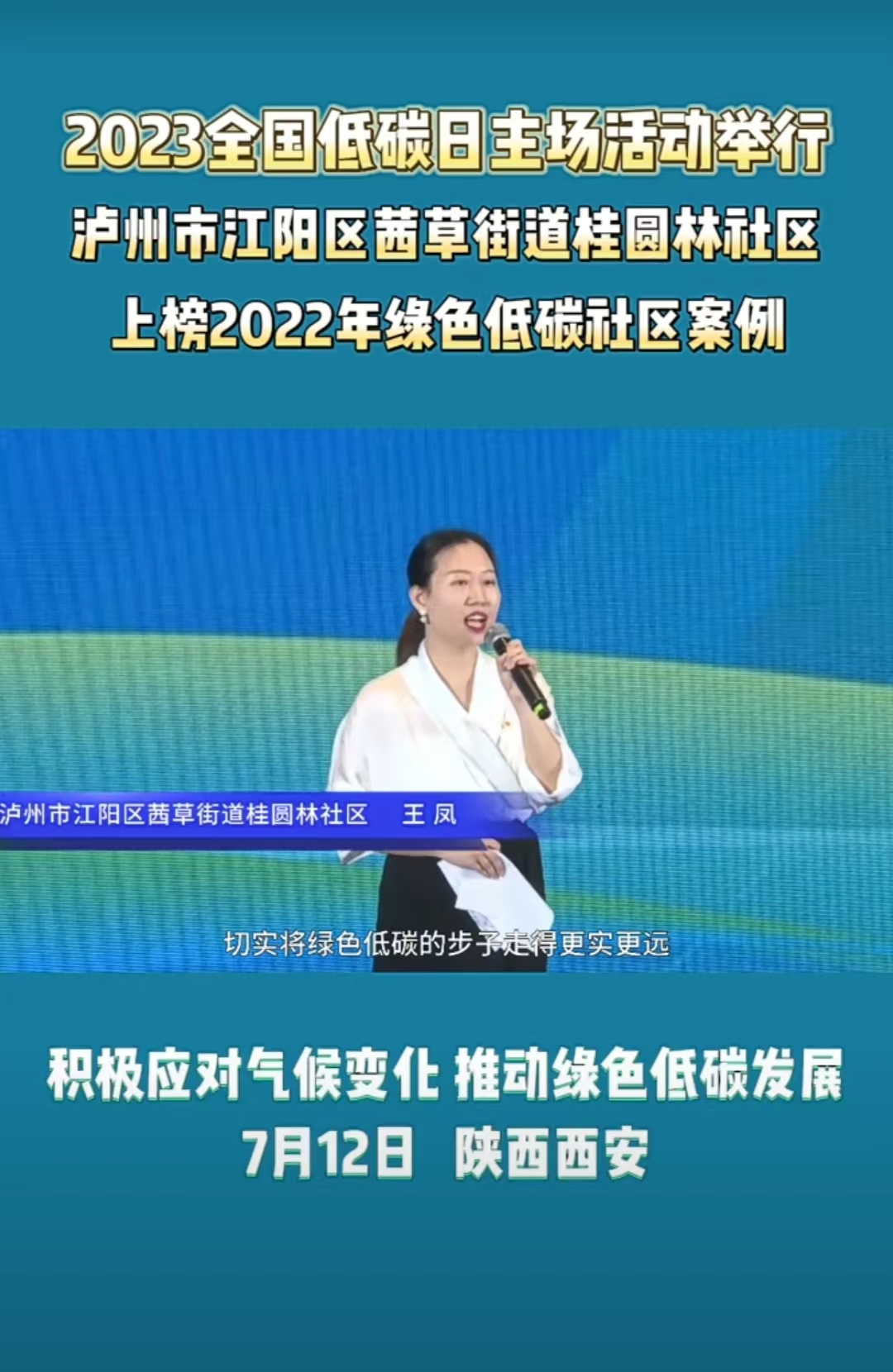 7月12日,在陜西西安舉辦的2023年“全國低碳日”主場活動中揭曉了2022年綠色低碳典型案例征集活動獲選名單,其中,瀘州市江陽區茜草街道桂圓林社區上榜2022年綠色低碳社區案例并現場交流發言。
