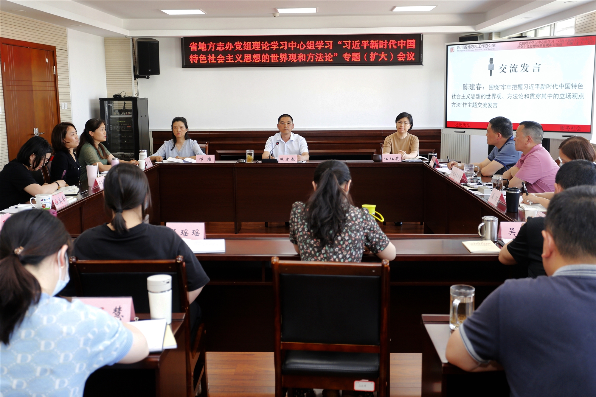 2023年5月18日,四川省地方志辦黨組理論學(xué)習(xí)中心組召開學(xué)習(xí)“習(xí)近平新時代中國特色社會主義思想的世界觀和方法論”專題學(xué)習(xí)會,圍繞“牢牢把握習(xí)近平新時代中國特色社會主義思想的世界觀、方法論和貫穿其中的立場觀點方法”開展專題研討。會議集中觀看專題片《領(lǐng)航》,傳達(dá)中央學(xué)習(xí)貫徹習(xí)近平新時代中國特色社會主義思想主題教育領(lǐng)導(dǎo)小組辦公室文件及5月17日省委理論學(xué)習(xí)中心組專題學(xué)習(xí)會精神,集體學(xué)習(xí)《習(xí)近平新時代中國特色社會主義思想的世界觀和方法論專題摘編》。辦黨組書記、主任陳建春主持學(xué)習(xí)會并作《深刻把握“六個必須堅持” 指導(dǎo)推進(jìn)全省地方志事業(yè)高質(zhì)量發(fā)展》主題發(fā)言。