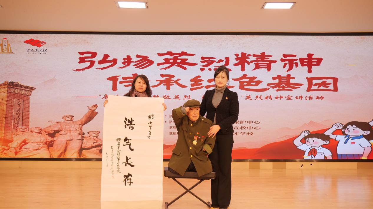 3月14日,由退役軍人事務廳主辦的“賡續?2025?致敬英烈 薪火相傳”英烈精神宣講活動,在成都市七中育才學校(水井坊校區)熱鬧開場。“全國最美退役軍人”“全國模范退役軍人”、長津湖戰役幸存者周全弟老英雄,以及黃繼光紀念館副館長、黃繼光侄子黃擁軍走進校園,以“親歷者講述+歷史見證+青春對話”的創新形式,讓課本中的英雄故事鮮活起來。退役軍人事務廳黨組成員、副廳長吳敏,成都市七中育才學校教育集團校長臧玲出席了此次活動。?